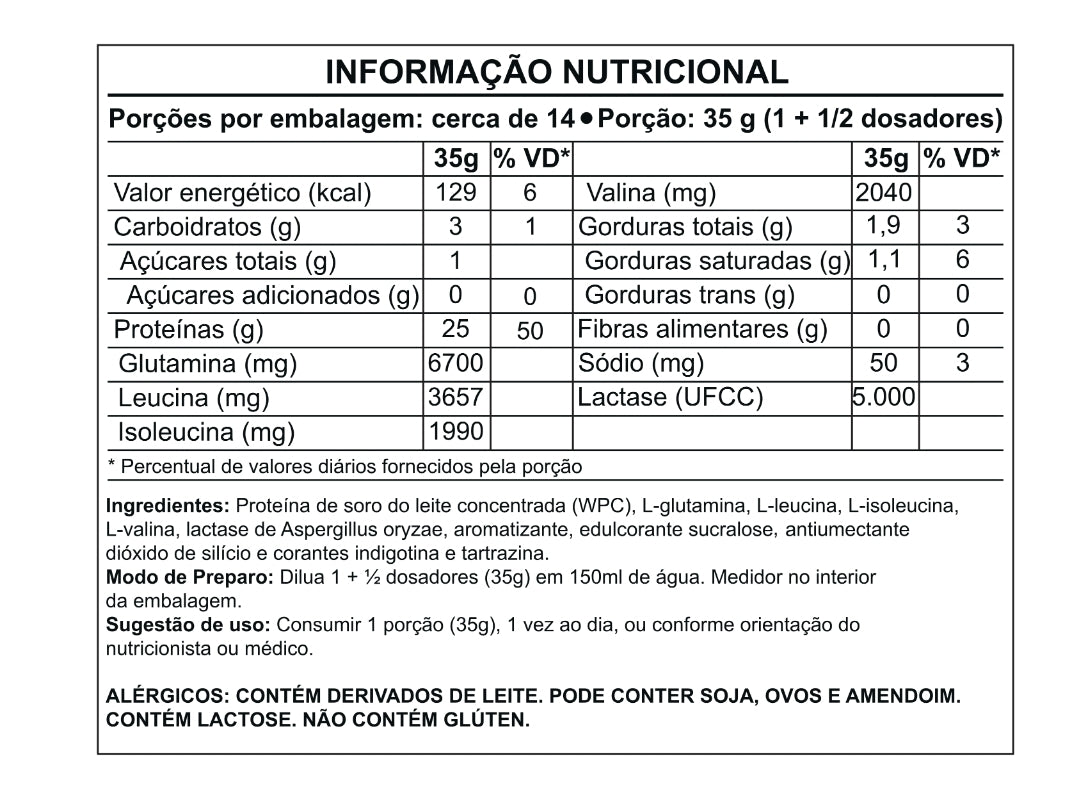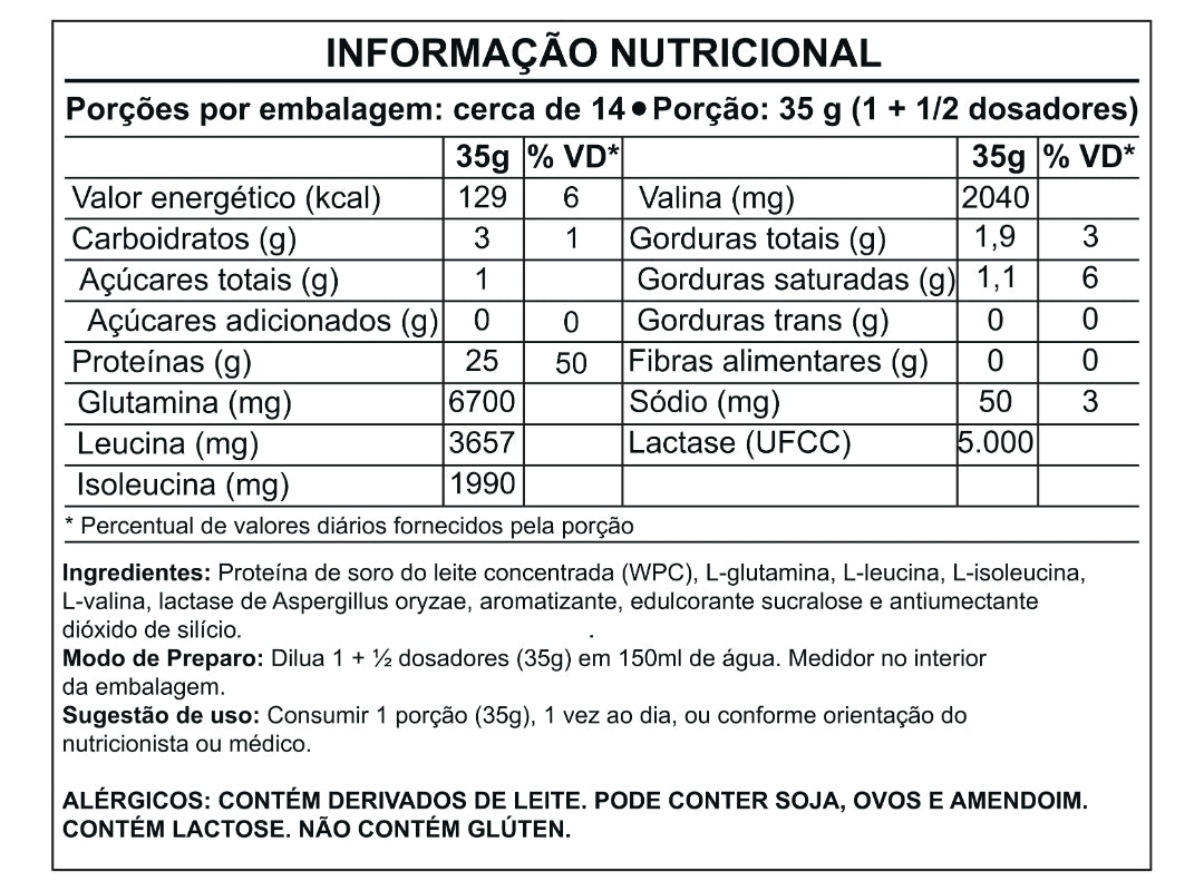 Nosso Whey contém a enzima lactase, que auxilia na digestão da lactose e garante mais conforto para quem tem sensibilidade. Isso significa que você pode aproveitar os 25 g de proteína por dose com muito mais leveza, sem abrir mão da qualidade nutricional, da recuperação muscular e de todos os benefícios da glutamina presentes na fórmula.
